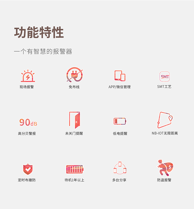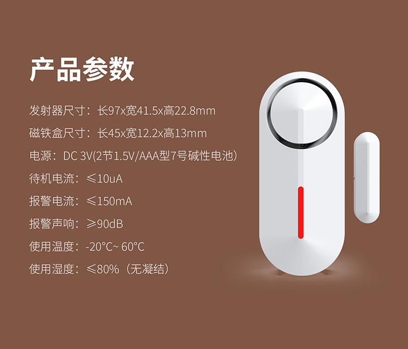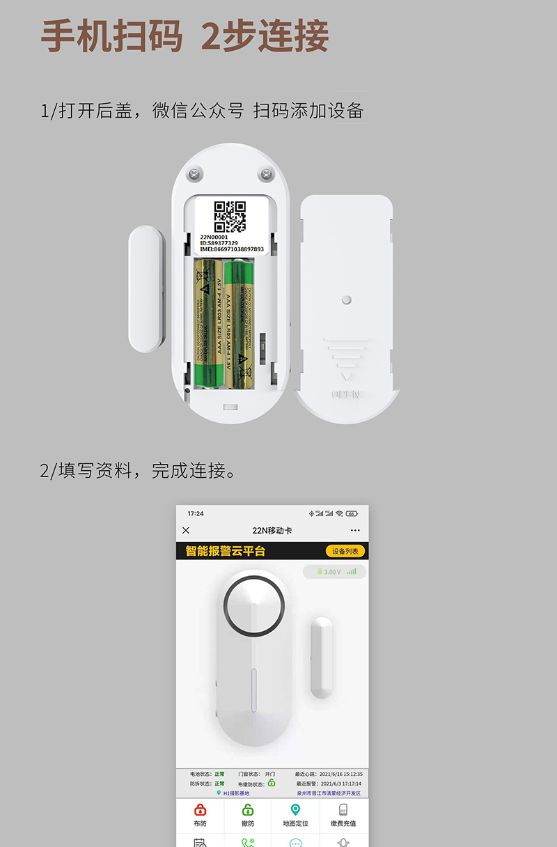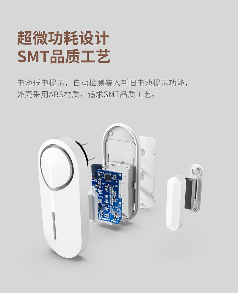 产品简介:NB物联网门磁探测器,采用低功耗设计,用来探测门、窗、抽屉等物体是否被非法打开或移动的智能报警器。本产品适用于监控各类门、窗的开关状态,通过磁簧感应原理,快速对门、窗开关状态进行分辨,并通过NB-iot物联网将信号传输到物联网管理平台,管理平台收到报警信号后,可实现通过小程序、PC管理平台、网络短信等推送相应的管理员,从而防止非法闯入,捍卫财产安全。待机1年以上