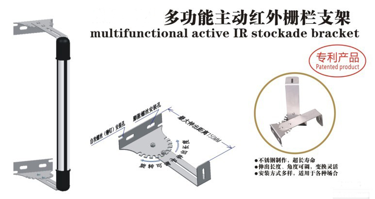 多功能主动红外对射/栅栏支架系列专利产品是主动红外对射/栅栏安装方式的一次革命,产品采用工业化标准化生产,免除现场测量及定制之烦恼,其所有零部件采用不锈钢材料制作,超长寿命。应用范围广泛,角度、高度变化灵活,适用于各种围墙、墙面用栏杆、可降低人工成本,加快工程进度,提高工程质量。