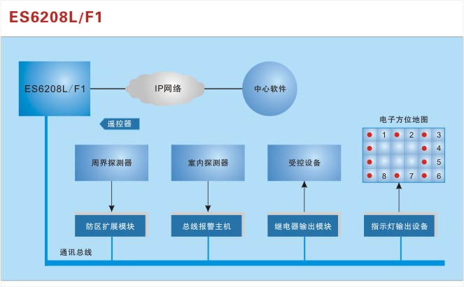 最多可接32个防区:有线无线兼容,自身带有32个无线自学码防区,通过总线通讯接口下接外扩32个防区扩展模块或者ES系列总线8防区主机,最多可以支持32个扩展防区;支持联动功能,可实现电子地图、DVR报警输入、模块就地报警等功能;通过局域网(TCP/IP)实现与上级中心计算机联网。