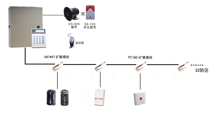 总线制报警主机就不同于以上的结构,它是把前端探测设备开关信号接在地址模块(或叫报警模块、防区扩展模块)上,